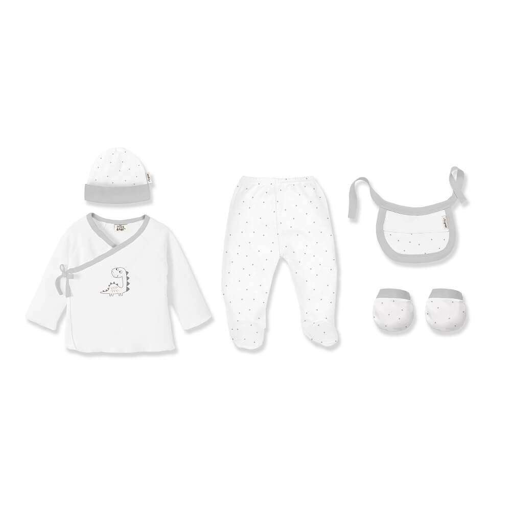 5-teiliges Baby-Erstausstattungs-Set – Design „Dinosaurier“ (Weiß/Grau)