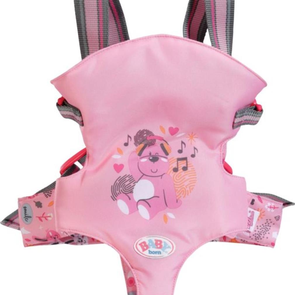 „„Oh! Ah!… BABY born kommt aus dem Deuten und Strampeln gar nicht mehr heraus. Im Tierpark gibt es so viele tolle Tiere. Da sitzt sie mit dem Blick nach vorne in ihrem Tragesitz und bestaunt die Ziegen, Fischotter, Hirsche & Co. In der Höhle mit den Fledermäusen möchte sie lieber umgekehrt sitzen und sich an Mama oder Papa ankuscheln können. In der dunklen Grotte ist es doch ein bisschen unheimlich. Die Innenseite und der Hüftgurt der Trage sind mit süßen Grafiken bedruckt. Auf dem rosa Außenstoff sitzt Bär Bruno genauso entspannt wie BABY born innen drin. Dank des verstellbaren Gurtsystem können sich Mama und Papa immer mal mit dem Tragen abwechseln. •