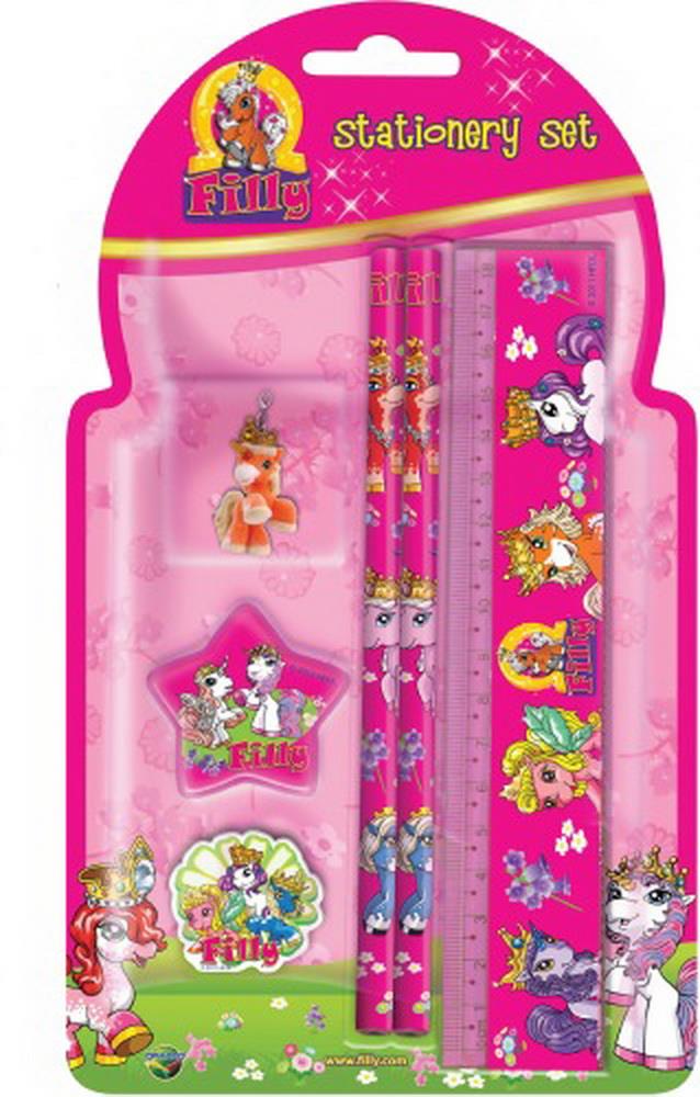 Das Set beinhaltet: zwei Bleistifte, ein Lineal, einen Radiergummi, einen Spitzer, Jedes Set enthält zusätzlich noch eine Filly Figur.