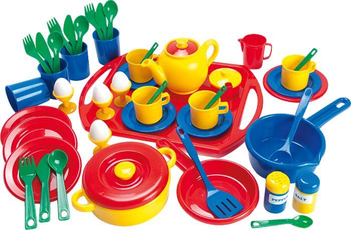 Bestehend aus: 4 Esslöffel, 4 Gabeln, 4 Messer, 5 Teelöffeln, 4 Ei Becher, 4 Eier, 4 Becher, 4 Teller, 4 Untertassen, 4 Tassen, 1 Zuckerdose, 1 Deckel zur Zuckerdose, 1 Sahnekännchen, 1 Teekanne, 1 Deckel zur Teekanne, 1 Pfanne, 2 Topf, 1 Deckel zur Topf, 1 Spachtel, 1 Löffel, 1 Salzdose, 1 Deckel zur Salzdose, 1 Pfefferdose, 1 Deckel zur Pfefferdose, 1 Tablett. Für Kinder. Ab 3 Jahren.