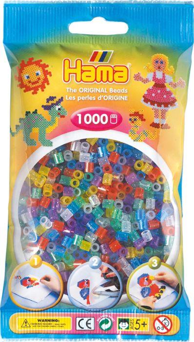 Beutel mit 1000 HAMA-Perlen im Glitter-Mix: 6 Farben (Glitterrot, Glittergelb, Glitterblau, Glittergrün, Glitterweiß, Glitterlila). Ab 5 Jahren.