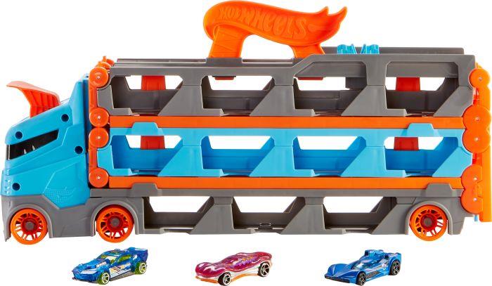 Der Hot Wheels 2-in-1 Rennbahn-Transporter setzt neue Maßstäbe für Aufbewahrung und Rennspaß mit Hot Wheels – mit einem richtig coolen Sattelschlepper, der voller Überraschungen steckt. Kleine Schaufenster im Anhänger geben den Blick auf die mehr als 20 Hot Wheels Fahrzeuge frei, die er transportieren kann, und wenn Kinder den hinten befindlichen Riegel ziehen, wird aus dem Sattelschlepper eine mehr als 180 cm lange Rennstrecke. Ungenutzte Fahrzeuge bleiben sichtbar unter dem Track verstaut und die Fahrerkabine des Transporters verwandelt sich in einen Doppelstarter, der zwei Fahrzeuge in ein episches Kopf-an-Kopf-Rennen schickt. Auf den Gewinner wartet gleich das nächste Abenteuer, wenn Tracks mit anderen Hot Wheels City Sets (separat erhältlich) verbunden werden. Das Multifunktionsfahrzeug enthält drei Hot Wheels Fahrzeuge im Maßstab 1:64 und fasst 20 weitere Fahrzeuge (separat erhältlich). Es bietet endlosen Spielspaß für Kinder im Alter von 4 bis 8 Jahren! Abweichungen in Farbe und Gestaltung vorbehalten.