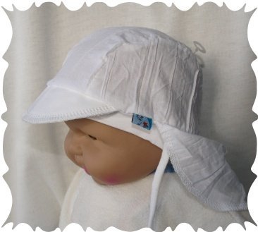 Die Nackenschutzmütze Ken ist weiß und aus reiner Seersucker-Baumwolle. Sie ist atmungsaktiv, sodass sich unter der Mütze keine Hitze stauen kann. Gleichzeitig ist dieses Material sehr pflegeleicht. Sie können die Mütze einfach bei 40 °C waschen. Es ist nicht nötig, die Nackenschutzmütze Ken zu bügeln, denn der Stoff ist knitterfrei. So kann sie auch einmal in die Wickeltasche gesteckt werden und sieht danach trotzdem noch schön aus.