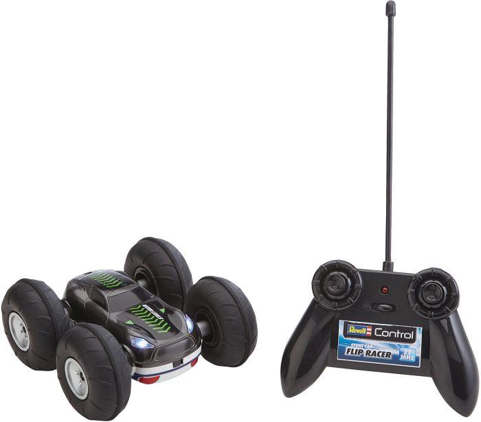 Das 2 Side-Car vereint Jäger und Gejagter in einem Car. Bei jedem Flip schlüpfst Du in die andere Rolle. Unterstützt durch große Ballonreifen, dem Einzelradantrieb und der LED Scheinwerfer lässt sich der FlipRacer auch im Dunkeln exakt steuern. Sofort einsatzbereit, keine lange Ladezeiten durch Einsatz von AAA-Batterien. (4x 1,5V AA battery und 1x E-Block 6LR61 benötigt / nicht mitgeliefert) 2-Kanal-RC Stunt-Car mit MHZ-Fernsteuerung – Kraftvoller Allradantrieb – Mit 180°-Flip und 360°-Spin-Funktion – 2side Function – Beidseitig fahrbar – Mit effektvoller LED Beleuchtung Lieferumfang: 1 x Modell 1 x MHz-Fernsteuerung 1 x Bedienungsanleitung