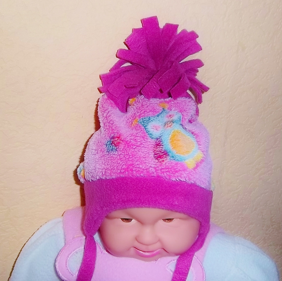 Schöne Mütze mit Eulenmotiv und Fransenbommel.