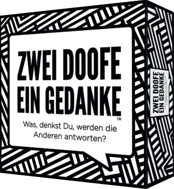 Zwei Doofe ein Gedanke ist ein mitreißendes Spiel mit hohem Funfaktor. Dabei muss jeder Spieler versuchen dieselbe Antwort abzugeben wie die anderen Spieler. Je mehr Spieler so wie Du geantwortet haben, desto mehr Punkte erhältst Du. Der Spieler, der am Zug ist, liest die Frage laut vor und lässt jeden ein wenig darüber nachdenken und zählt dann runter 3, 2, 1… dann antworten alle gleichzeitig im Chor. Mach Dich gefasst auf jede Menge Spaß, komplett falsche Einschätzungen und lustige Antworten! Zwei Doofe ein Gedanke ist ein verrücktes, temporeiches und super lustiges Spiel mit 440 Themen. Ein ideales Geschenk und Mitbringsel für jede Gelegenheit, lustige Partys und gesellige Abende! Ab 12 Jahren, ab 2 Spieler.